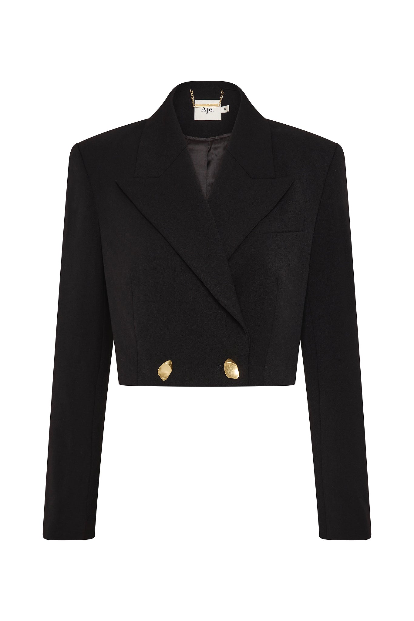 - Double-breasted front with two feature buttons