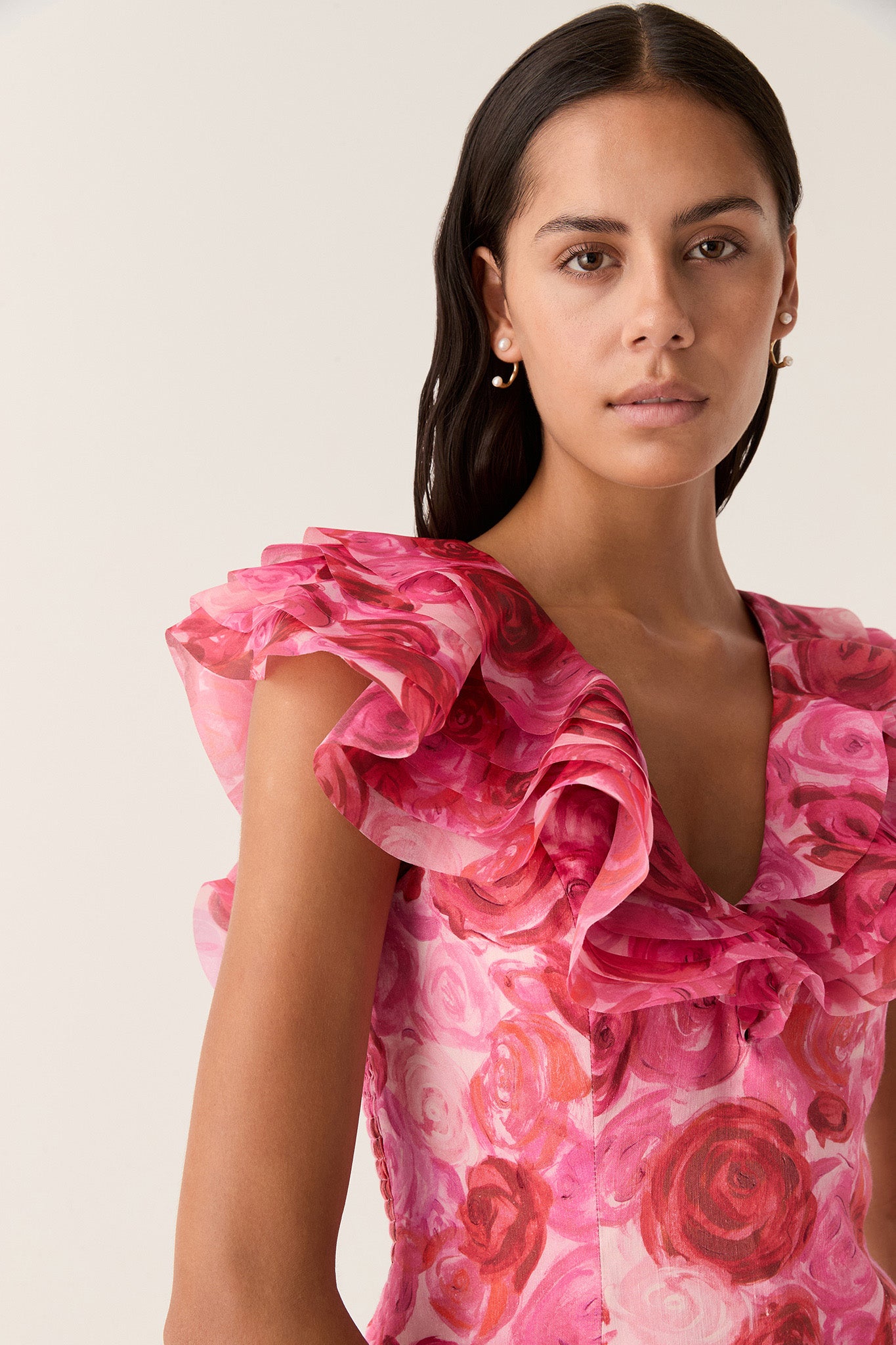 - Layered neckline and shoulder frills